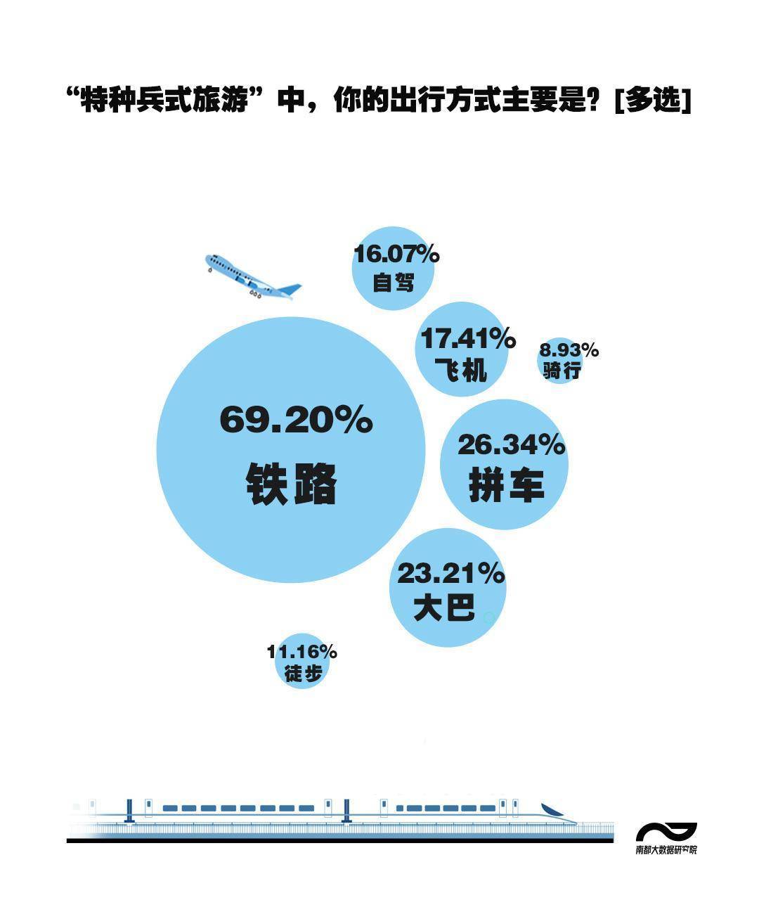 那么,体验过“特种兵式旅游”的年轻人喜欢哪种出行方式呢?调查结果显示,铁路出行位居首位,受访青年选择的比例占69.20%;其次是拼车和大巴,分别占26.34%、23.21%。