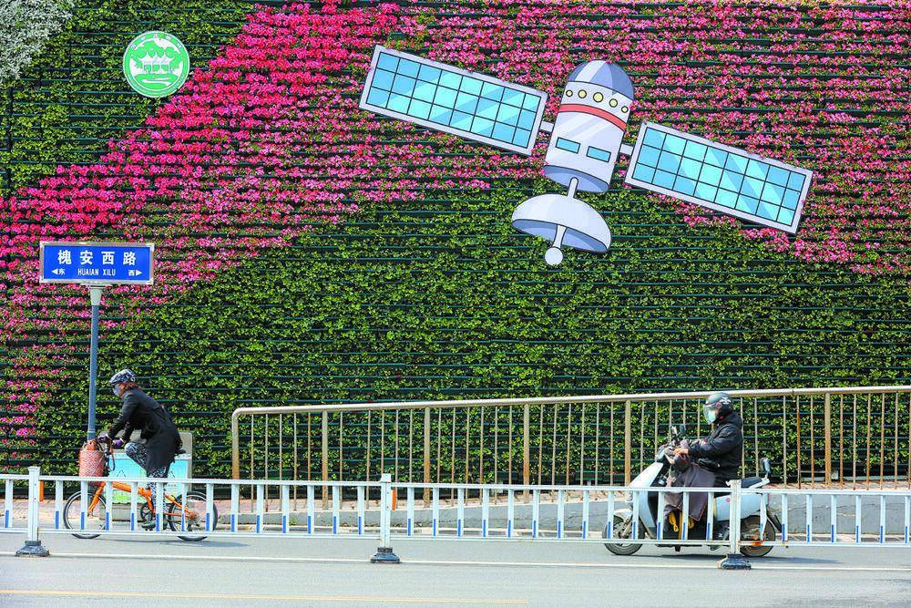 在槐安路与维明街口,四个角都形成了五彩的花墙,但风格各异:有的动感十足体现运动趣味,有的为一家人悠闲游园画面表达温馨亲情,航天主题花墙尽显科技元素……而中华大街附近的槐安路桥的桥柱也被装扮成了排排花柱,亮丽非凡。