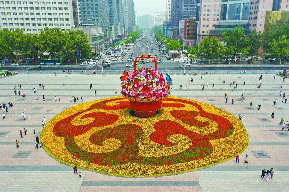 “祝福祖国”立体花坛位于河北博物院广场前,花坛直径46米,高16米,总面积1646平方米。