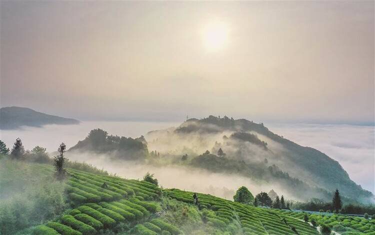 四月的江口县贵茶联盟观音山茶园基地绿意盎然,茶园随地势高低而蜿蜒起伏,灵动曲折,在清晨云雾中若隐若现,景美如画。