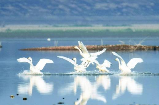 位于汉寿县的西洞庭湖湿地公园,白天鹅成群飞翔。