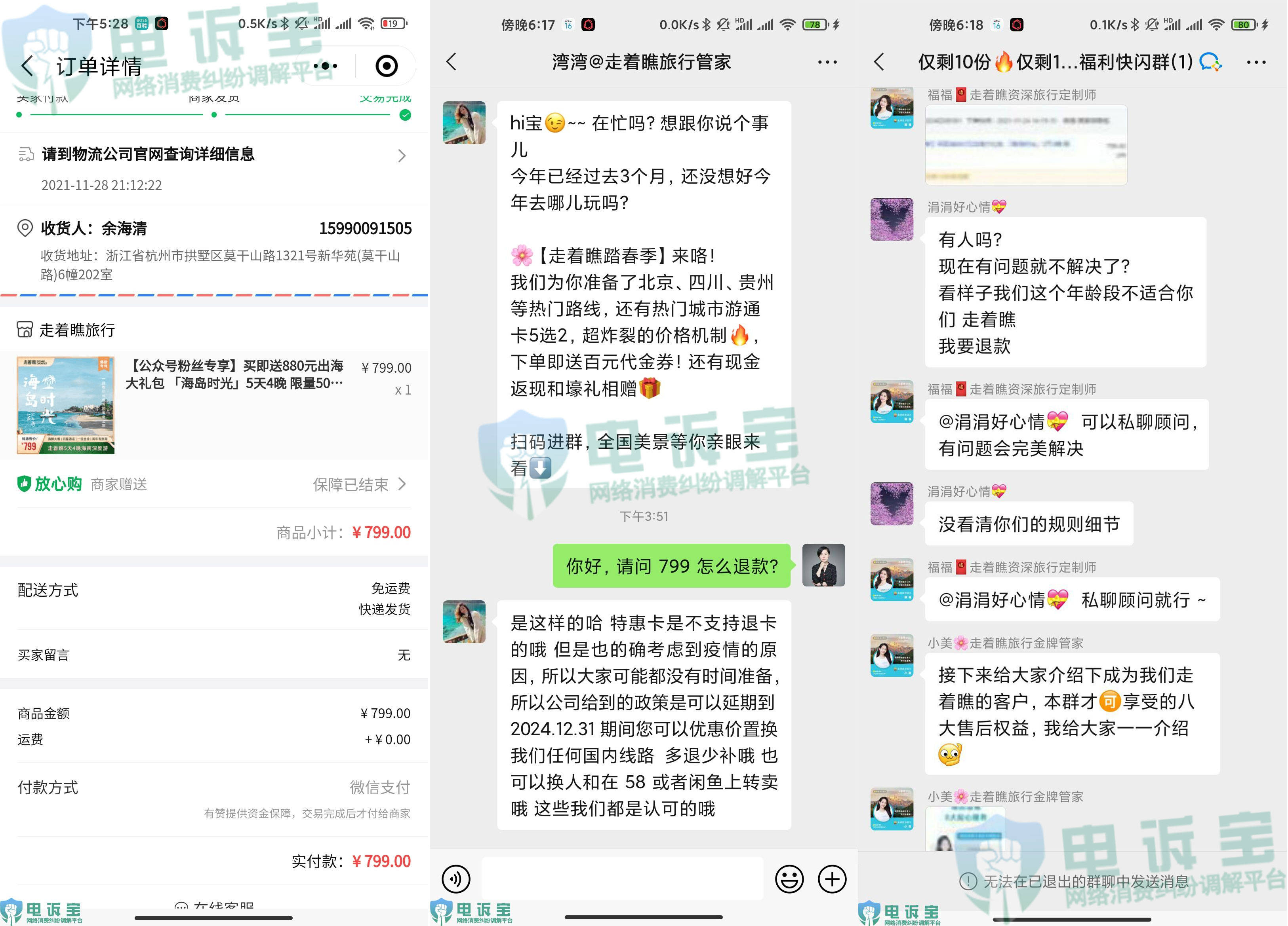 4月3日,浙江省的刘女士向“电诉宝”投诉称,她于2021年11月在有赞平台购买的走着瞧旅行社海岛游五天产品,共计799元,疫情期间一直无法出行,现在因走着瞧虚假宣传,因产品未使用想全额退款。购买时曾说两年内未使用可以退款。