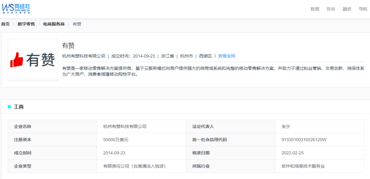 从网经社企业库(COP.100EC.CN)了解,有赞隶属于杭州有赞科技有限公司,该公司成立于2014年9月23日,法定代表人为朱宁,公司位于浙江省杭州市西湖区。有赞是一家移动零售解决方案提供商,基于云服务模式向商户提供强大的微商城系统和完整的移动零售解决方案,并致力于通过粉丝营销、交易创新、消保体系为广大商户、消费者搭建移动购物平台。
