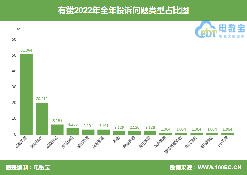 此外,“电诉宝”受理用户维权案例显示,2022年全年,有赞疑似存在退款问题,其占比高达51.064%,网络欺诈占比20.213%,此外,还有退换货难、虚假促销、发货问题、商品质量、其他、网络售假、霸王条款、信息泄露、冻结商家资金、售后服务、客服问题、订单问题等问题。