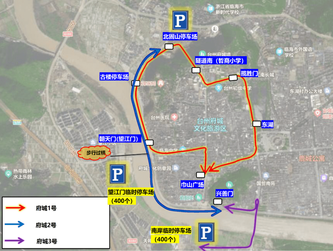 北固山停车场-古楼停车场-朝天门(望江门)-巾山广场-东湖-揽胜门-隧道南(哲商小学)-北固山停车场