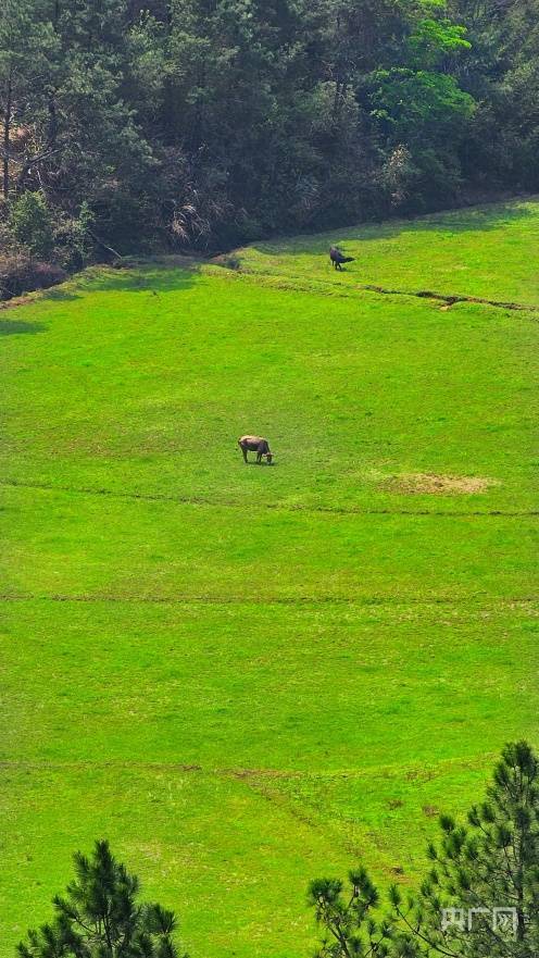 登上马脑,往山岩另一面远眺,林海莽莽,一片宽大的绿草地在森林和山体之间蜿蜒,通过远摄镜头拉近,几头牛正在草地上悠闲地吃草。这种意境令人心旷神怡,在秀美江南的村寨,还隐藏着如此壮美的“草原”。