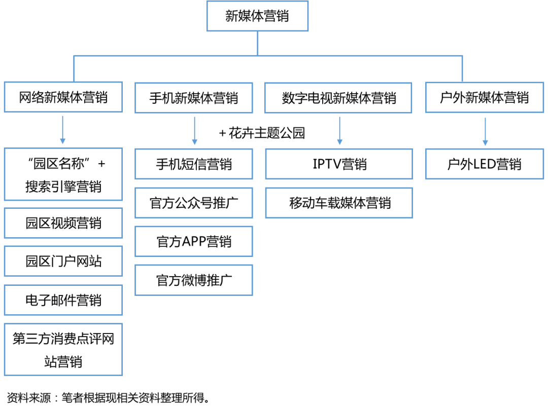 花卉主题公园的宣传营销也需要与时代发展以及游客需求相结合。随着现代科学技术的不断发展,传统的电视、广播、杂志和报纸等已经不能满足人们接受信息的需求,而互联网等新的传媒方式正在逐渐取代传统的媒介方式。新媒体营销成了重要的宣传模式。新媒体是以数字信息技术为基础的媒体形态,其具有数字化与模拟性、交互性与即时性、超文本与海量性、个性化与社群化等特征。随着时代的发展,新媒体以其信息发布速度快,信息接受即时性高的特点,成为当今宣传营销中重要的部分,新媒体营销包括网络新媒体营销、手机新媒体营销、数字电视新媒体营销以及户外新媒体营销,新媒体营销以其低廉的成本、广泛的应用和健全的模式而受到广大用户的喜爱。所以在花卉主题公园的宣传推广方面,要充分利用新媒体的传媒优势,结合花卉主题公园可采取如下图所示的措施,分别从网络、手机、数字电视与户外传媒四个方面入手,加大推广宣传。