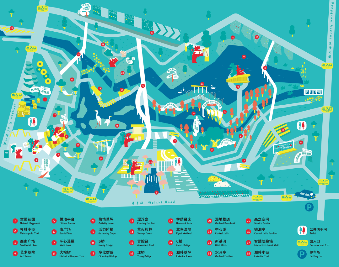 推荐景点:活力阶梯、杉林小径、水涧亭、湿地栈道、净化群落、环心漫道、西南广场、森之空间