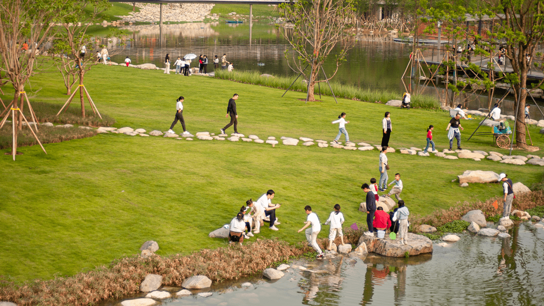 在中心公园,收获一份宁静。这里的植物和动物也都是慢的。此刻,中心公园里刚刚种下的2000多株树木正在慢慢向下扎根,100多种植物刚刚舒展开新的叶脉,向天空、向水里……几只池鹭刚刚小心翼翼试探着这里的水草,蜻蜓刚刚在空中悬停,小蝌蚪也刚刚从石缝里探出脑袋……它们,正在游历、正在生长。
