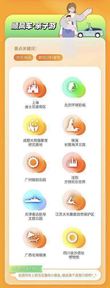 很多家庭带孩子出游时,关注娱乐性和科普趣味性,希望孩子能够在快乐玩耍中增长知识和见识。基于此场景,嘀嗒出行从嘀嗒顺风车大数据出发,为用户推荐了“亲子游”前十大顺风车出游热门景点,分别为:上海迪士尼度假区、北京环球影城、成都大熊猫繁育研究基地、珠海长隆海洋王国、广州融创乐园、沈阳方特欢乐世界、天津泰达航母主题公园、大丰麋鹿自然保护区、广西北海银滩、四川金沙遗址博物馆。