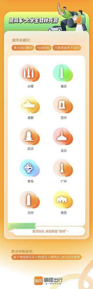“五一”假期临近,嘀嗒出行基于平台顺风车大数据,发布了一份场景定制式《2023五一顺风车热门旅游景点预测和攻略》,围绕“亲子”“适老”“好友”“大学生特种兵”等四大典型出游场景,呈现40个顺风车热门旅游景点和城市,以期为用户提供一份独特和个性化的顺风出游指南。