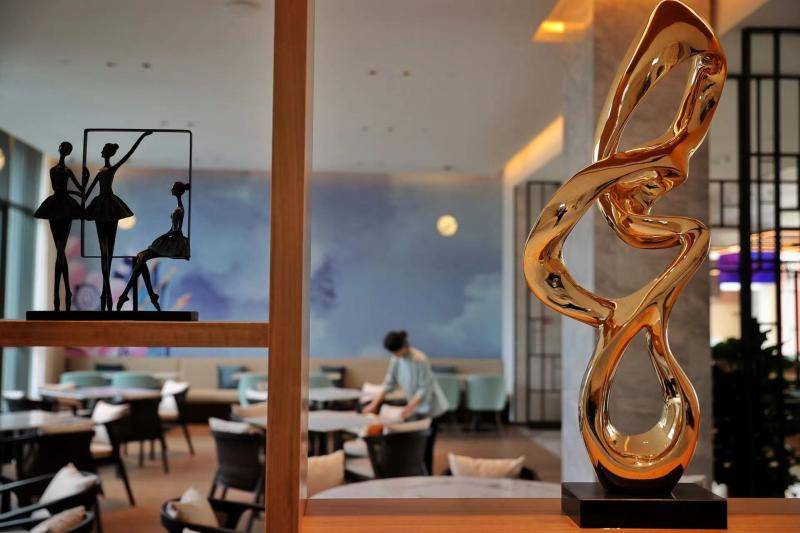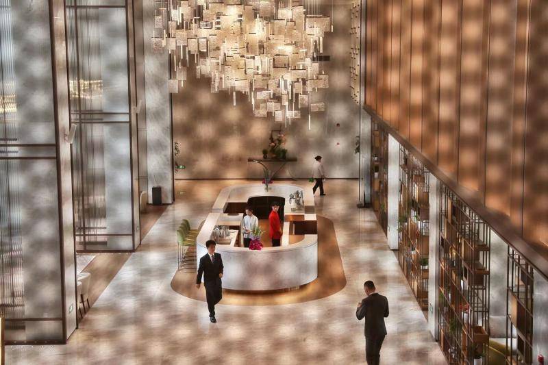 据介绍,酒店建筑面积约2.35万平方米,外立面宽阔大气,主体银色部分采用穿孔铝板,背后设置有灯片,在夜晚能呈现星星点点的光影;中心由古铜色仿铜板及格栅构成的“T”字造型,寓意“台湖”,夜晚在灯光的映照下很有艺术美感。走进酒店内部,浓厚的艺术与时尚气息扑面而来,各具特色的艺术吊灯在周边背景衬托下富有感染力,将光与影完美结合。