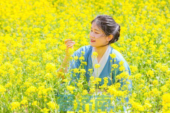 微风阵阵,沁人心脾的香味传来,蝴蝶、蜜蜂在花丛中翩翩飞舞,进行一场独属于春天的忙碌。金黄的油菜花与蓝天白云相互映衬,绘制出一幅美丽醉人的田园画卷。花丛中,不少身着汉服的游客驻足停留、拍照打卡,记录下传统服饰与烂漫花开碰撞的美。更有不少孩童花丛嬉戏,与飘忽灵动的蝴蝶相互追逐,家长们拿起手机、按下快门,定格下这和谐美好的画面。