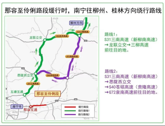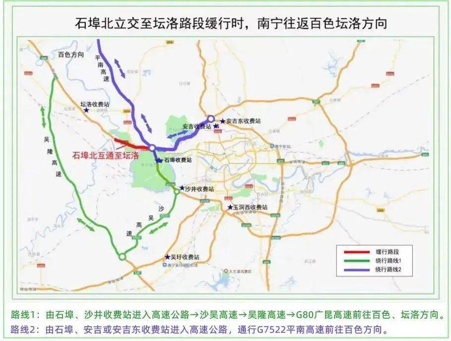 需要注意的是, G7201南宁绕城高速石埠北枢纽石埠往安吉方向匝道封闭施工,途经车辆请绕行城市道路。