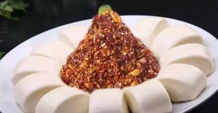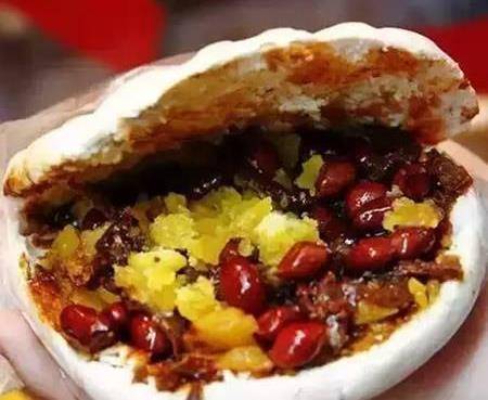 这个就是用饦饦馍夹着各类配料做成的。先抹上一层辣酱,然后铺一层咸菜,再夹上两三个咸鸭蛋黄,最后再洒上几粒酥脆的花生米,这样配合起来吃的夹馍吃起来很有层次感。