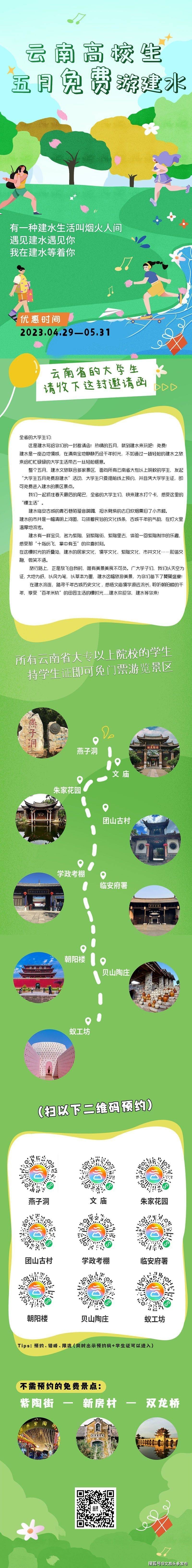 此外,整个五月,建水文旅联合多家景区,面向所有云南省大专以上院校的学生,发起“大学生五月免费游建水”活动,云南省在校大学生只要通过游云南APP提前线上预约,并且凭大学学生证,即可免费进入建水的景区景点。