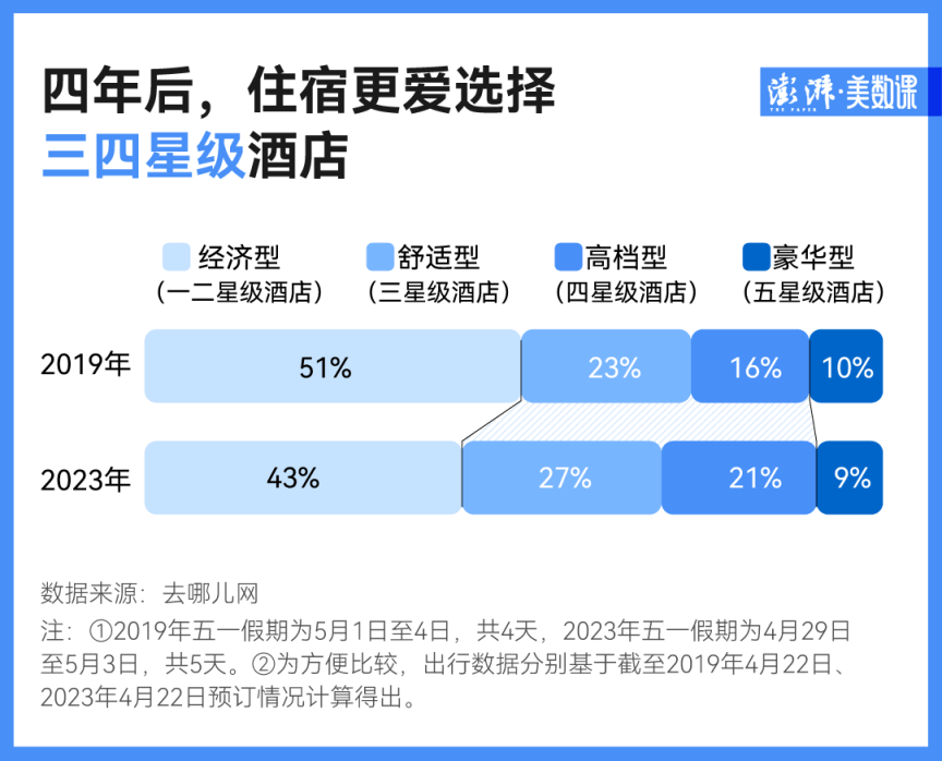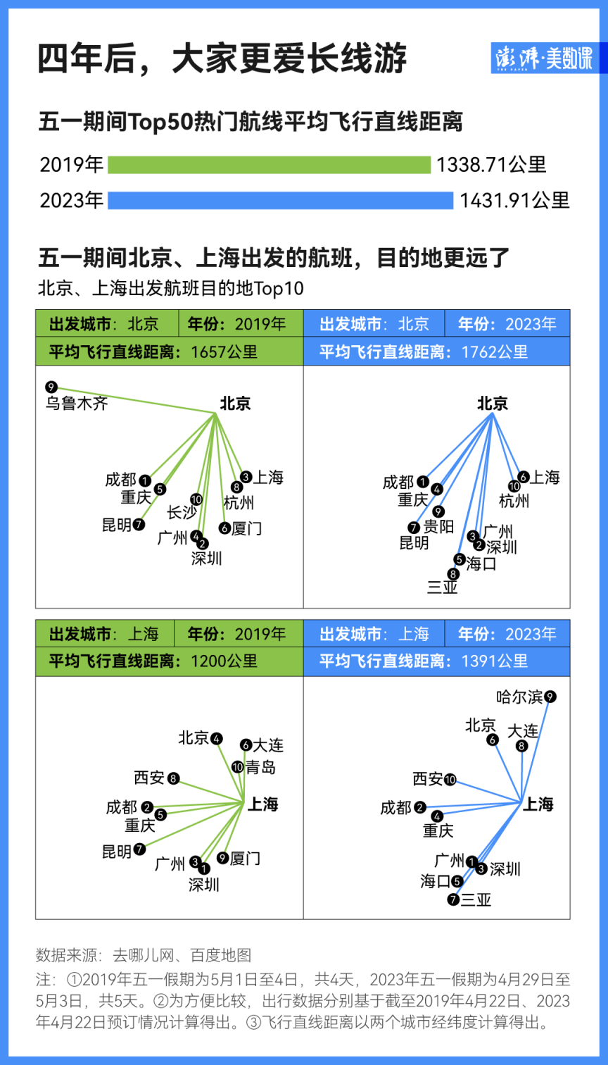 和2019年相比,四年后的五一假期出行有何变化?澎湃新闻记者通过分析机票、酒店预订大数据,逐一剖析解答。