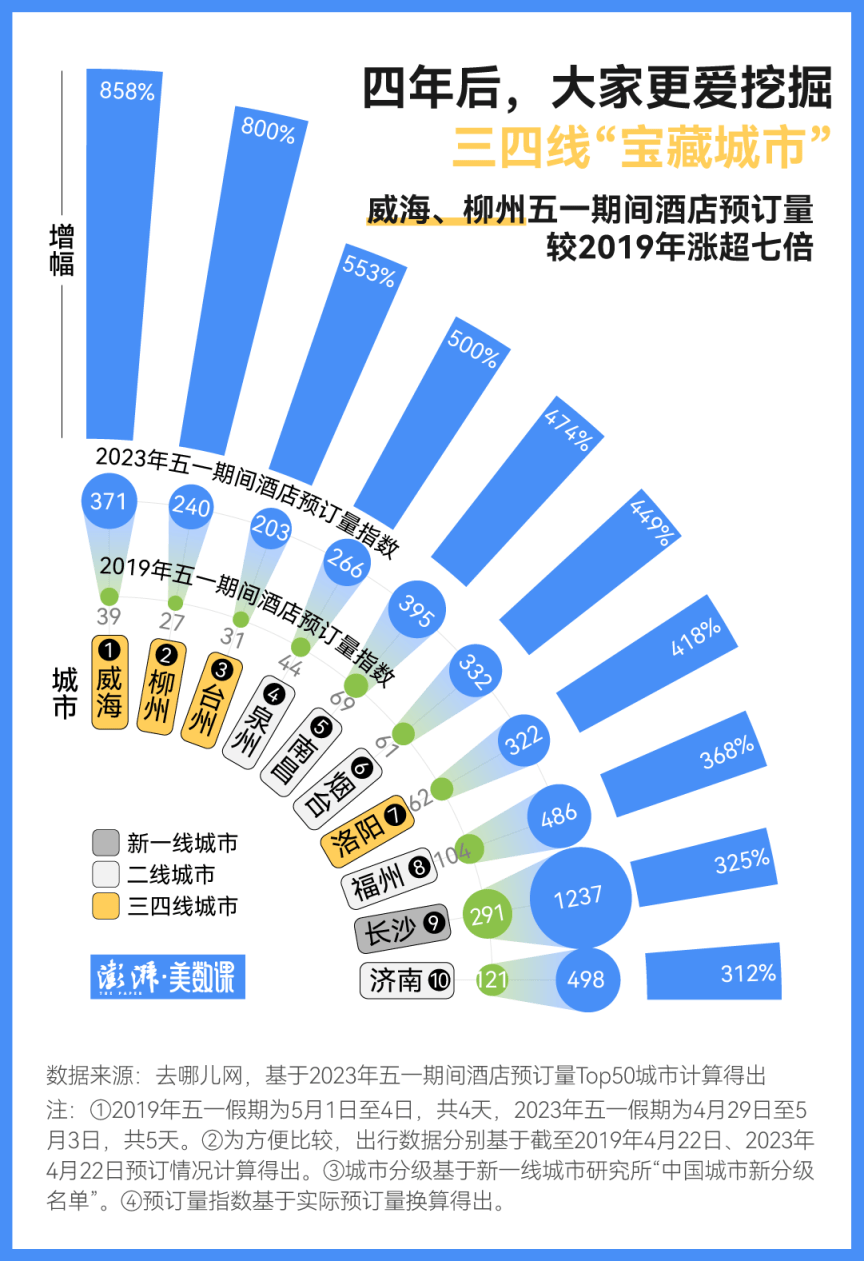 不只是淄博,澎湃新闻记者分析了2023年五一期间酒店预订量Top50城市榜单,发现在这50座热门城市中,较2019年同期增幅最高的前三名皆为三四线地区。