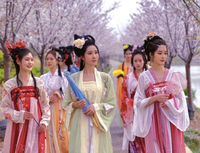 好一派鹤舞樱飞、漫天樱粉的浪漫场景。樱花文化节期间,30余万株、87个品种的樱花争奇斗艳,灿若锦绣。4500米长的华夏南路花团锦簇,器乐、舞蹈、走秀、摄影展等多项活动“樱”邀赴约。华夏北路上,文创市集、汉服巡游、樱花绘画展和《樱扇书生》舞蹈快闪演出等,装扮出一道亮丽的樱花风景线。“樱花里”成为浪漫的爱情胜地,蔷薇花墙写满了美好愿景,贡多拉小船在水中游荡,樱花造型的冰淇淋、巧克力、首饰、团扇等琳琅满目的潮玩文创让人爱不释手,为甜蜜和浪漫加码。