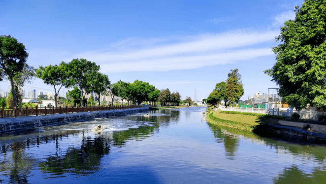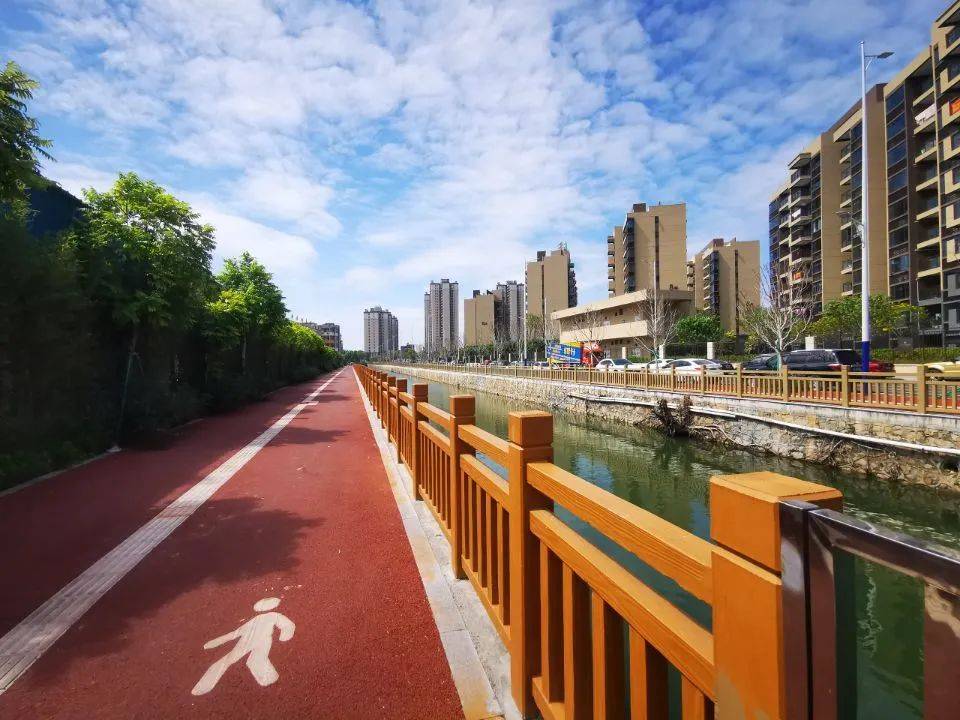 大陂河全长约9.7公里,漫步大陂河边,平整宽阔的碧道两旁,树叶迎风摇曳,河水清清,倒映着两岸整齐的栏杆,令人心旷神怡。