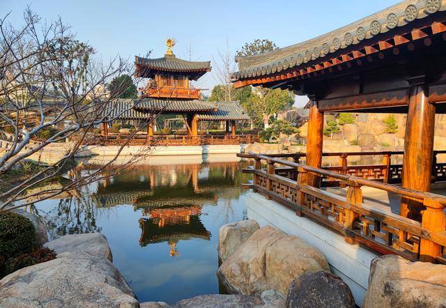 不仅如此,上海宝山寺还有占地30亩的配套园林,其中有塔、阁、楼、台、水榭、水池、牌楼等,建筑同样采用非洲红花梨纯木结构。整个寺院建的非常的大气,纯木质的仿唐式建筑群看上去古朴厚重,完美又兼具高级感。而且全部用的是榫卯结构,据说连一根钉子也没用,因此这一期工程还成为了全国唯一一家获得鲁班建筑奖的寺院。日本寺庙和具有唐风风格的中式寺庙很像,上海宝山寺被误认为“日本寺庙”。