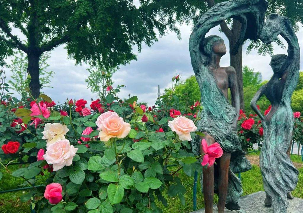 出片tips:大宁公园近3000株月季的第一波盛花期已来袭,“五一”期间为最佳观赏期。北门中心花坛1108㎡的空间内种植有624株树状月季,与雕塑“春之韵”动静辉映。此外,公园东块4米园路一侧500米长、2619㎡的狭长空间里,种植了1175株树状月季,“花中皇后”株型多姿花容秀美,开得壮观又浪漫。