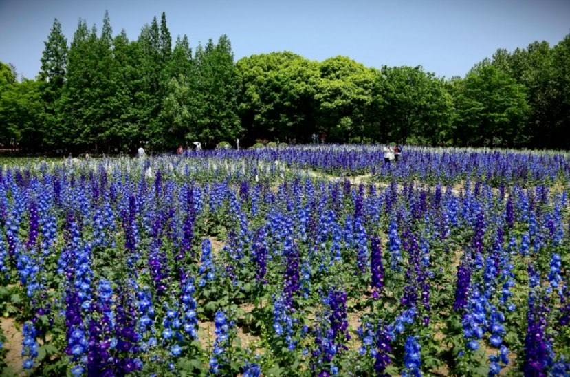 出片tips:世纪公园乡土田园区内种植了一片大花飞燕草,面积达10000平方米,总状花序密密层层令人心动。大花飞燕草不单只有蓝色,它颜色丰富,有蓝色、紫色、白色,视觉效果极佳。