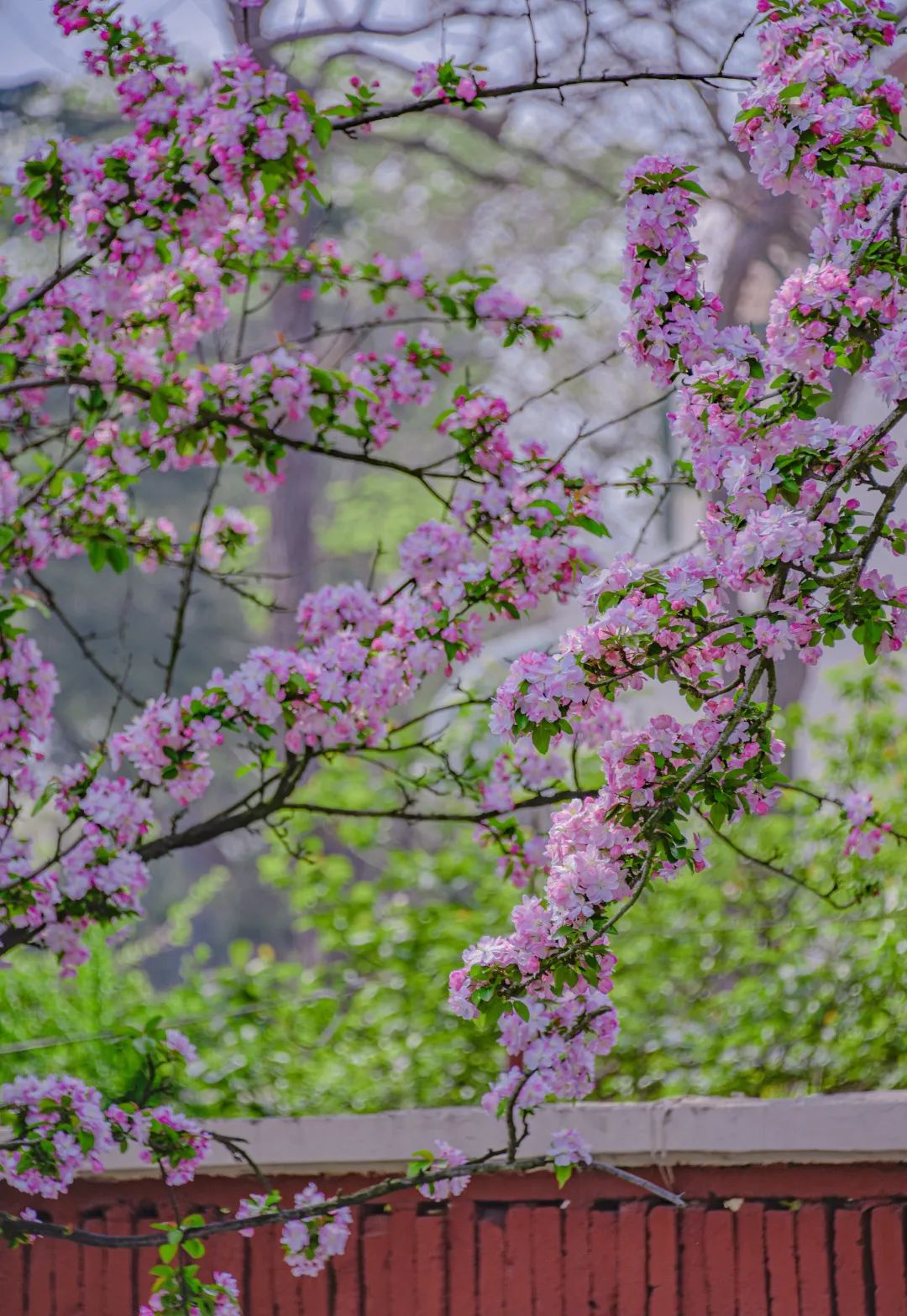 海棠花如重重珠缀,花开似锦,萦绕着淡淡的馨香,清风起,一阵花瓣雨就会飘落而下。整条路都披上了一层粉色的浪漫,惊艳着游人的眼眸。