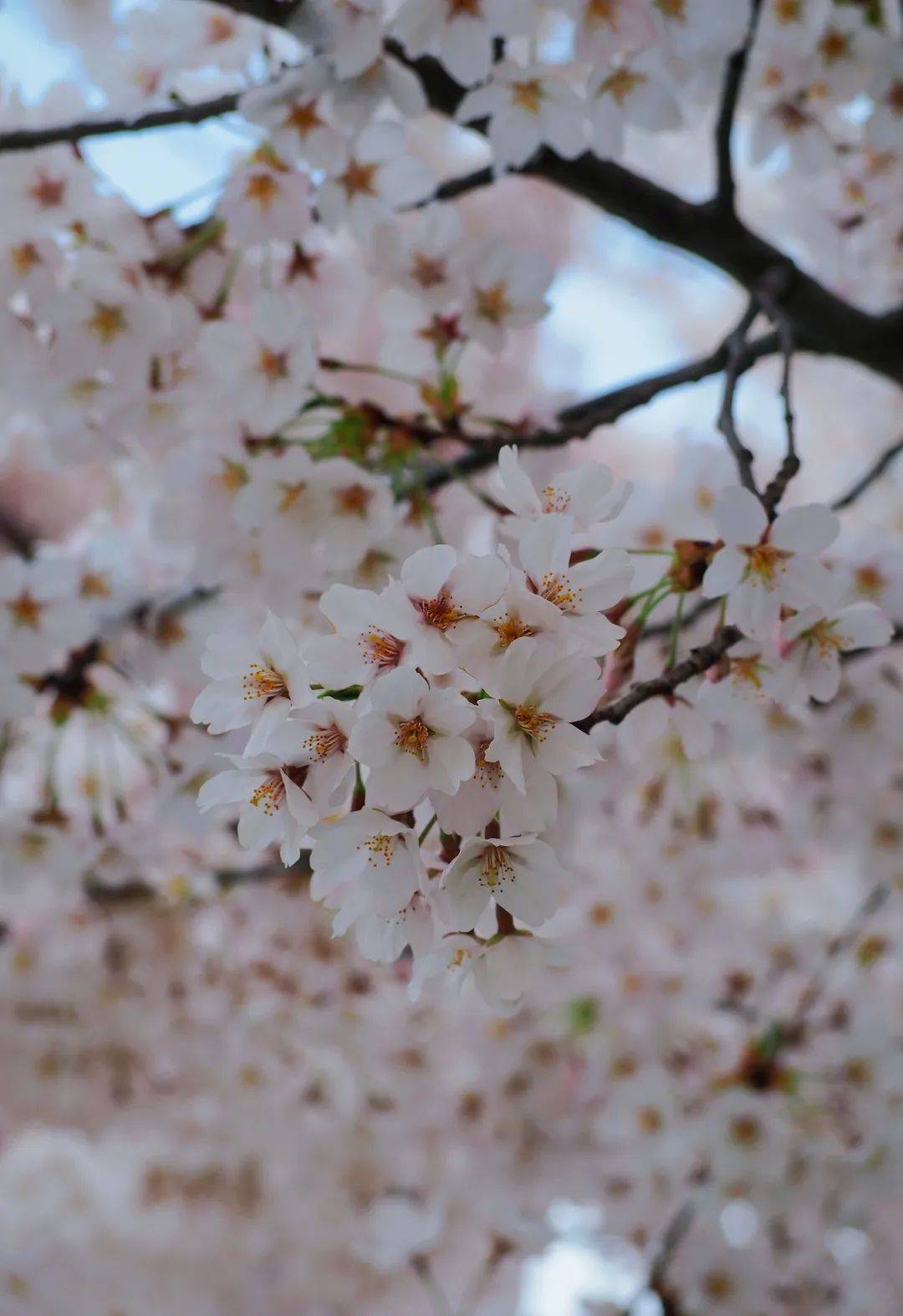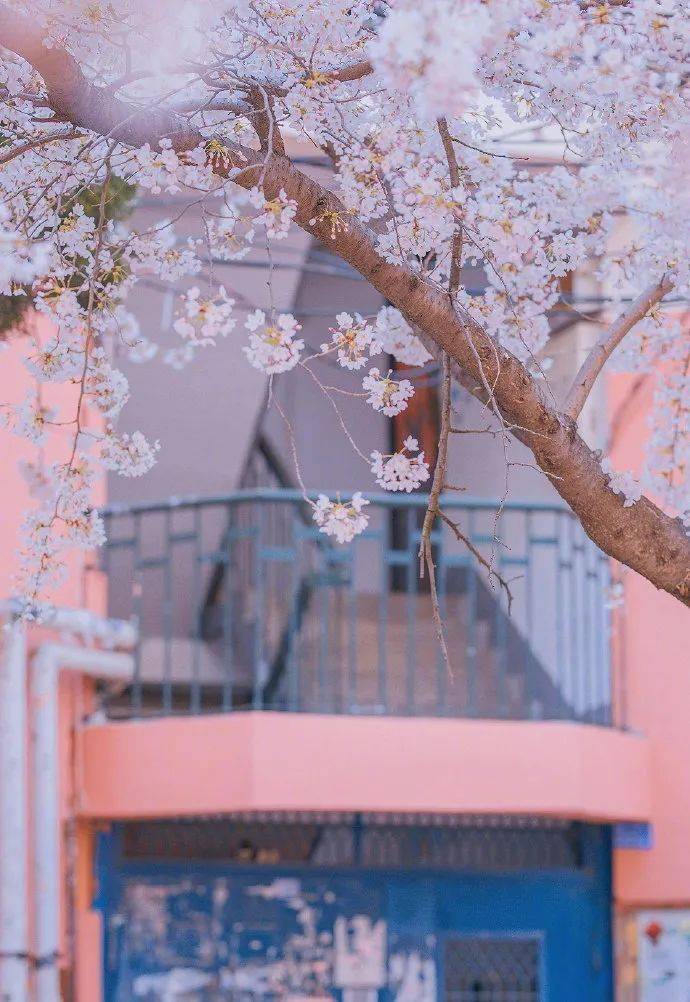 这条深藏在居民区的小路,道路两旁高大的樱花树,花枝浓密,相互交缠成自然的棚盖,入目一片朦胧的粉色海洋,景色壮美。