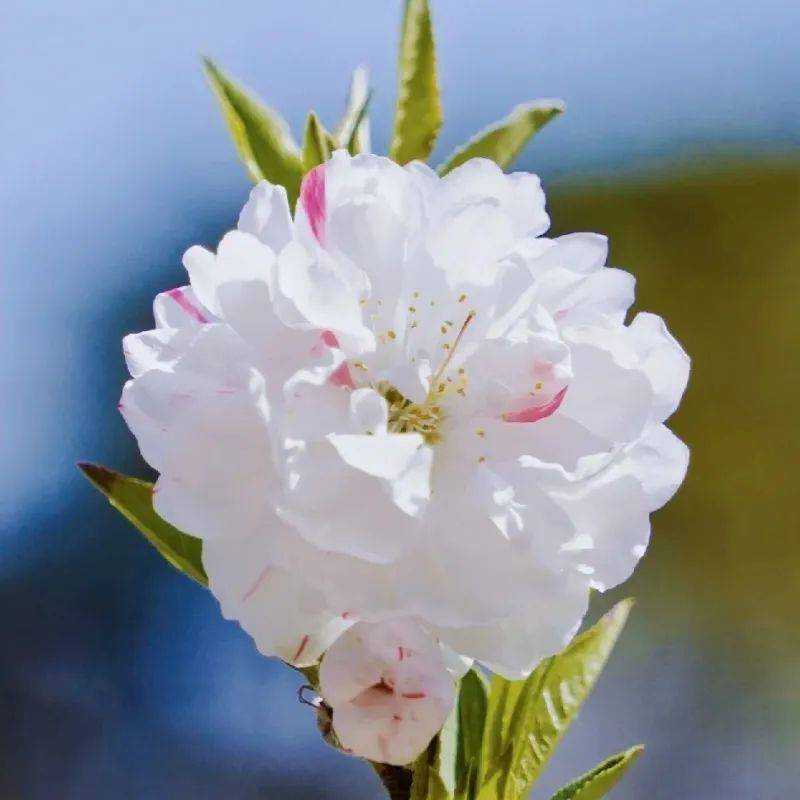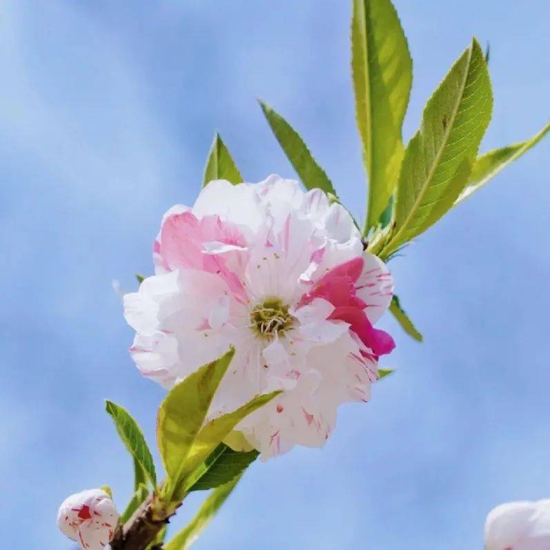 花开两朵,各表一枝。韶关路上的碧桃品种多样,洒金碧桃分外惊艳,一棵树上开出各种颜色的桃花,花瓣簇拥,圆韵雍容。白玉碧桃,纯白如玉般没有一丝杂色,风吹过,片片桃花瓣飘落似雪花。