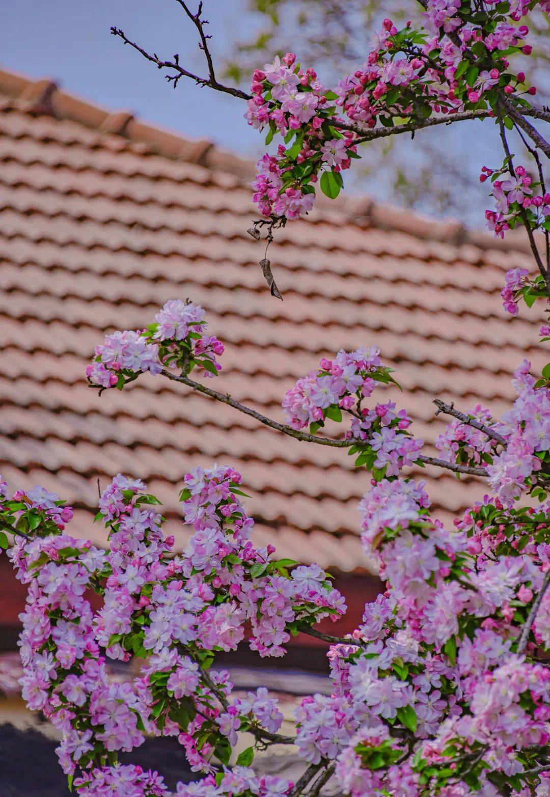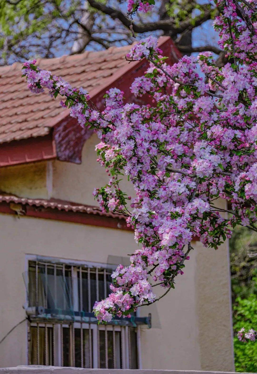 随风摇曳的海棠花,在百年老建筑的映衬下,更显娇艳,徜徉其中,仿佛进入了另一个时空。