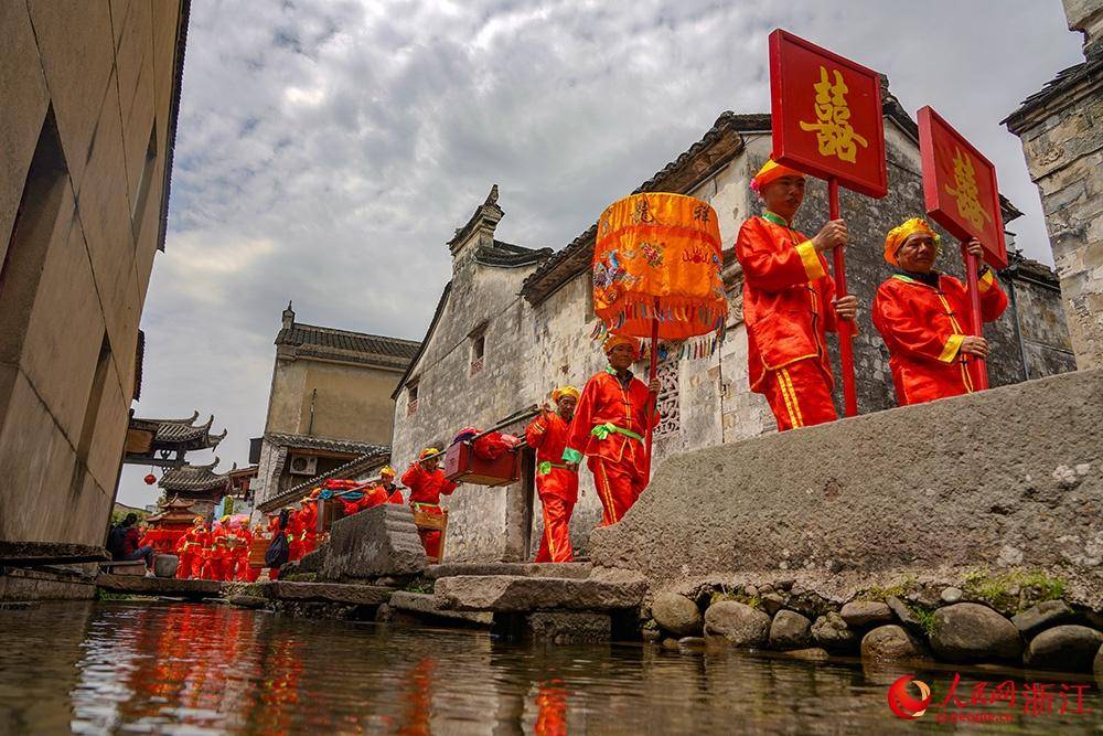 4月28日,十里红妆巡游在宁波市宁海县前童古镇上演。人民网 章勇涛摄