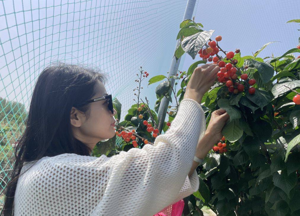 在园内,已经有络绎不绝的游客前来采摘品尝了,有带着孩子体验亲子采摘的、有三五成群结伴而来的、有前来采摘送朋友的......大家一边采摘,一边品尝。一位来自四川的游客告诉记者,她的家乡就是产这样的樱桃,鲜甜多汁,那是她怀念的家乡味道,没想到在重固章堰也能品尝到。