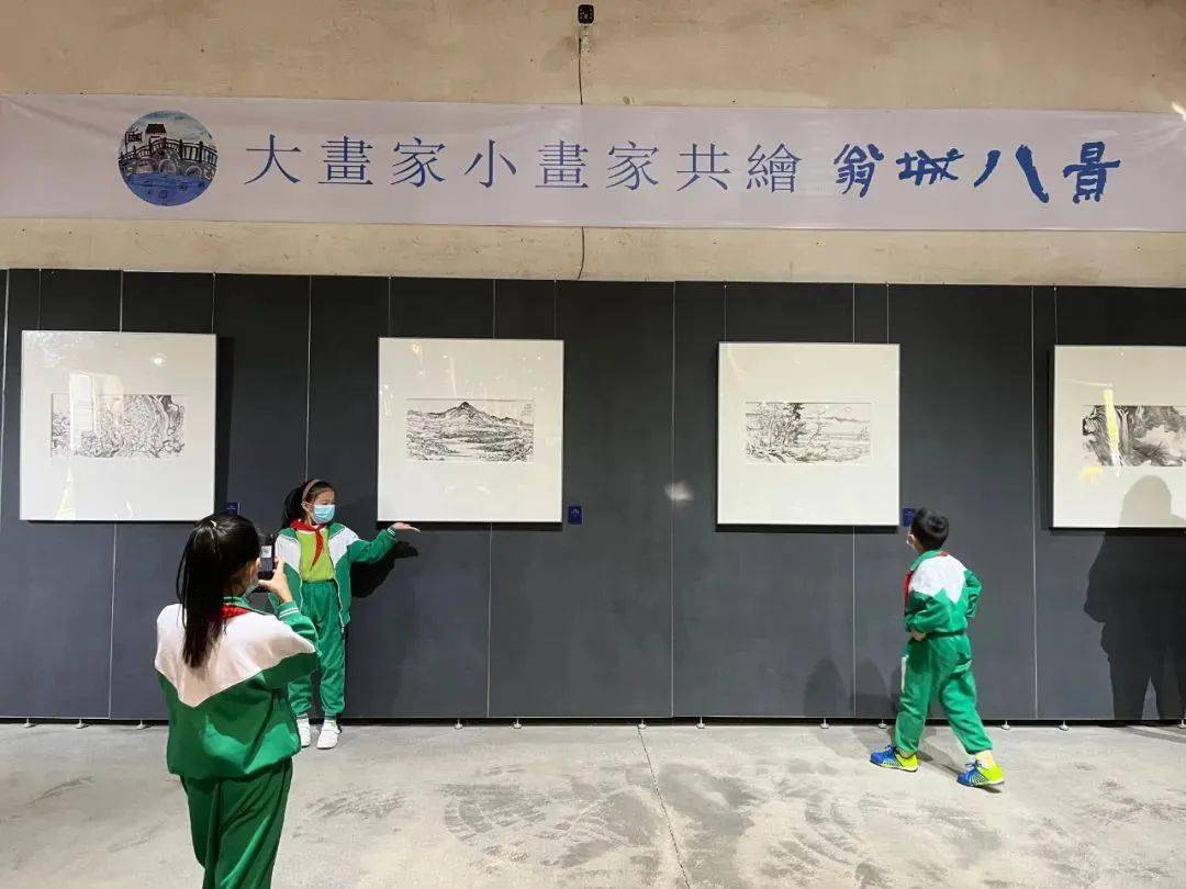 “大画家小画家共绘翁城八景”展览,图为小画家“打卡”大画家的画。