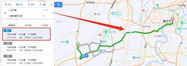 你看,从重庆新机场重庆璧山区正兴镇,到重庆主城区的解放碑步行街,走渝昆高速、成渝环线高速,最快需要1小时12分,如果打车,至少需要149元!