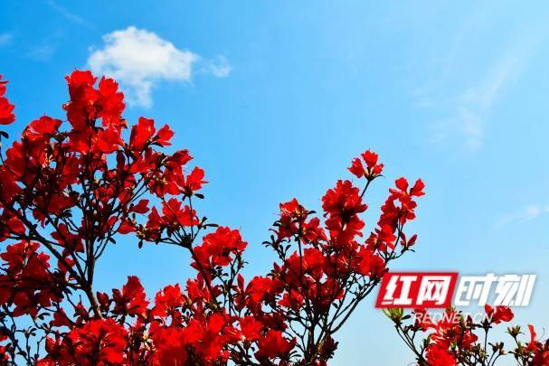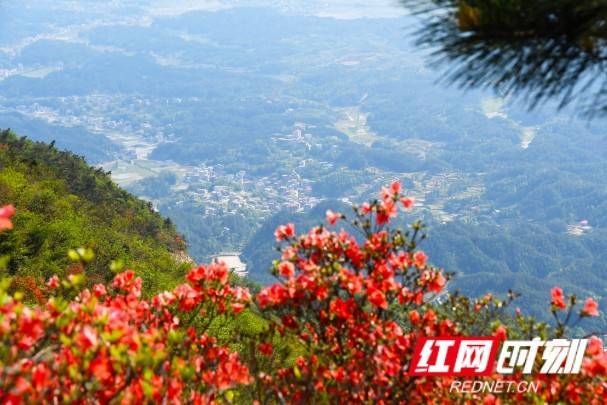 站在山顶,徜徉于红色花海中,呼吸着清新的空气,欣赏着眼前的美景,令人如痴似醉。一树树艳丽的杜鹃花,有的盎然怒放,拥挤堆叠;有的花骨含羞,娇艳欲滴;有的清香浮动,蜂蝶嬉戏;有的灿若红霞,染红天际.......此时极目远眺,远处山峦层叠,农舍阡陌,尽收眼底,令人心旷神怡,宛如人在景中走,景在画中游。