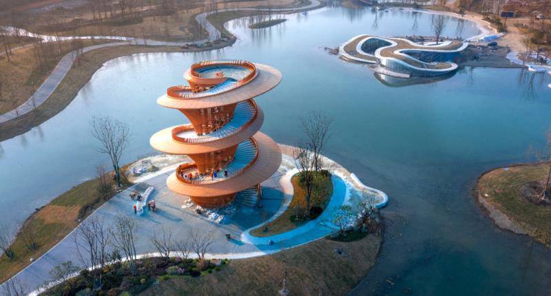位于葛仙山旅游度假区内的梨花·读乡村图书馆,运用传统材料和乡村建造技术,结合现有绿道、栈道系统,采用鸟巢造型,将坡屋顶、茅草等川西林盘建筑元素与现代风格相融合,现已成为网红打卡点。