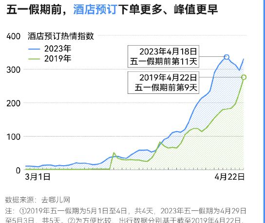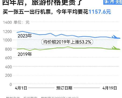 从个体感受上看,今年五一大众出行热情澎湃。但较四年前,真的高涨了吗?大数据告诉你,是的。不过,虽然出行更热情,但旅游价格也变贵了。全国各地旅游城市热门景点附近的酒店在“五一”假期前3天的价格均较平日高出2-3倍,甚至还有酒店价格上涨5倍,令人直呼“酒店刺客”。不仅是酒店,今年五一期间机票价格也有所上涨。