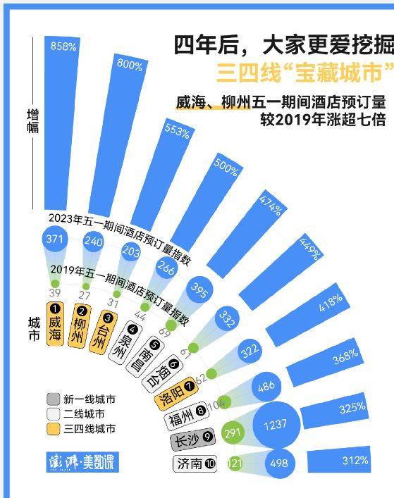 淄博成为新晋网红旅游城市。携程数据显示,淄博“五一”整体旅游订单较2019年上涨441%。不只是淄博,澎湃新闻记者分析了2023年五一期间酒店预订量Top50城市榜单,发现在这50座热门城市中,较2019年同期增幅最高的前三名皆为三四线地区。大众挖掘小众旅游打卡地的热情进一步释放,红利覆盖三四线城市。