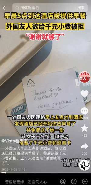 日前,一名外国女游客入住上海亚朵美影酒店,发现凌晨五点,酒店就已经开始供应特色早餐。为了感谢酒店的贴心服务,女游客留下了千元小费,但被亚朵酒店的工作人员礼貌退回。此事在社交媒体上被广泛关注,亚朵更是收获了广大网友的好评。