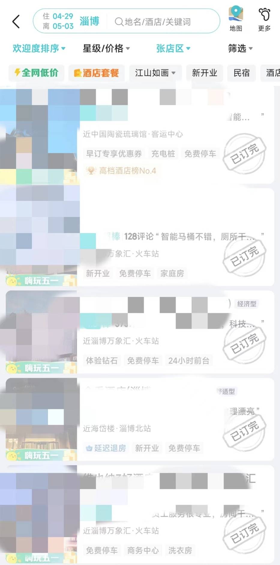 记者从各大旅游网址搜索五一期间淄博酒店,显示淄博市张店区酒店均已订完,仅剩个别酒店还有钟点房。