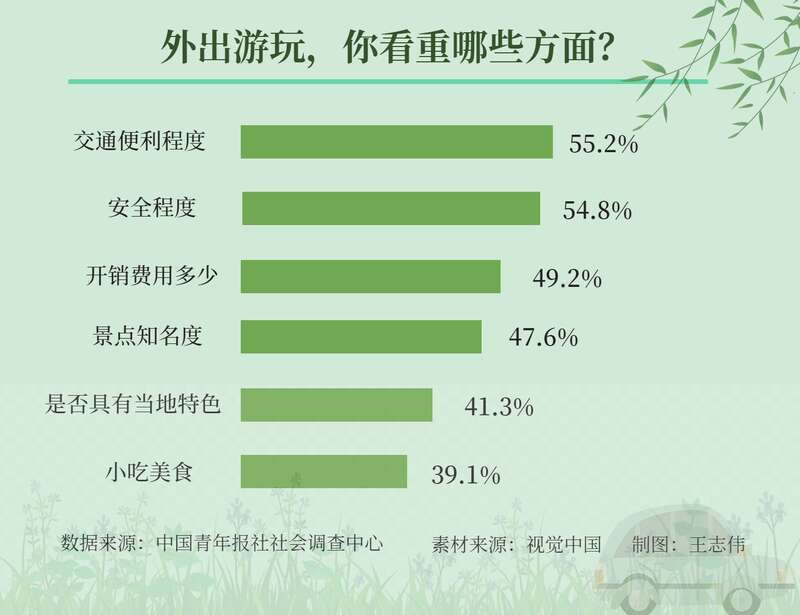 外出游玩,大家看重哪些方面?调查显示,交通便利程度(55.2%)和安全程度(54.8%)获选率更高。其他还有:开销费用多少(49.2%),景点知名度(47.6%),是否具有当地特色(41.3%),小吃美食(39.1%),人流量大小(38.1%),活动是否丰富(33.8%),旅行周期长短(26.0%),周边配套设施是否完善(22.2%)。
