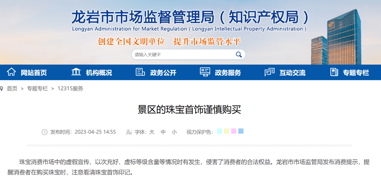 “五一”假期临近,一些景区成为热门旅游地。近日,福建省龙岩市市场监督管理局发布消费提示:珠宝市场鱼龙混杂,虚假宣传、以次充好、虚标等级含量等情况时有发生,消费者在购买时要注意看清珠宝首饰印记,特别是要谨慎购买景区的珠宝首饰。