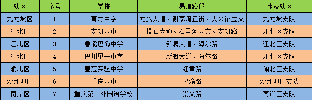 预计节日最后一天(5月3日)重庆大量初高中住读生将提前返校,在15时30分开始将迎来学生返校高峰,其中九龙坡区育才中学周边 龙腾大道、谢家湾正街、大公馆立交,江北区宏帆八中、鲁能巴蜀中学、巴川量子中学周边 松石大道、石马河立交、宏帆路、新溉大道、 海尔路,渝北区皇冠实验中学周边 红黄路,沙坪坝区重庆八中周边 汉渝路,南岸区重庆第二外国语学校周边 崇文路将出现时段性拥堵,至18时左右拥堵趋于正常。校园周边易堵路段如下表所示: