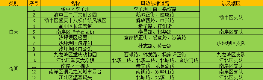 五一假期,重庆传统网红景区周边道路流量也将有所增加。白天时段,渝中区李子坝、二厂文创公园周边的 李子坝正街、 鹅岭正街、 健康路,十八梯、长江索道周边的 中兴路、解放西路、新华路、打铜街,九龙坡区重庆动物园周边的 西郊路、锦龙路、杨家坪正街,沙坪坝区磁器口、渣滓洞、白公馆周边的 童家桥正街、沙滨路、磁童路、壮志路、凌云路等网红景区周边道路在10时至16时易出现时段性拥堵。夜间时段,江北区大剧院周边的 北滨一路、北滨二路、北城路、金沙门路,南岸区南山一棵树周边的 龙黄公路、崇文路等网红景区周边道路在19时至22时易呈现车多缓行态势。易堵路段如下表所示: