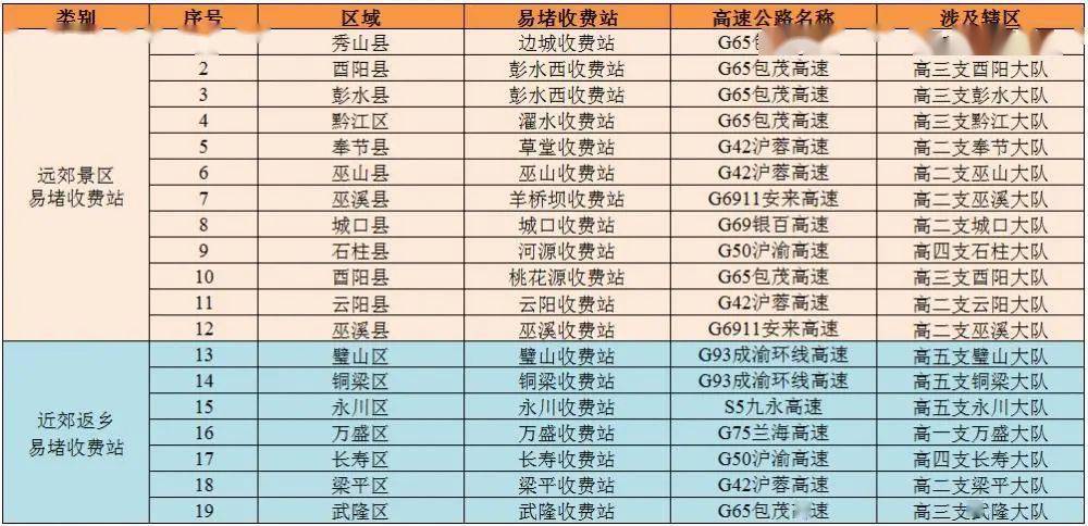 一是“5天长假”带动的长距离自驾游、远郊游景区将迎来车流集中出行,预计渝东南片区中,秀山县洪安古镇的G65包茂边城收费站,酉阳县龚滩古镇、彭水县摩围山景区的G65包茂彭水西收费站,黔江区濯水古镇的G65包茂濯水收费站;渝东北片区中,奉节县三峡之巅景区的G42沪蓉草堂收费站,巫山县小三峡景区的G42沪蓉巫山收费站,巫溪县红池坝景区的G6911安来羊桥坝收费站,城口县亢谷景区、黄安坝景区的G69银百城口收费站,石柱县黄水景区的G50沪渝河源收费站等远郊收费站车流量将明显增大。
