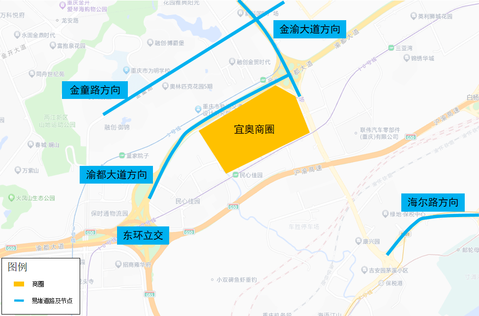 一是与宜奥商圈北边相邻的 金渝大道、 金童路,南边相邻的 海尔路,西边相邻的 渝都大道、 东环立交等商圈周边节点和道路易在10时至19时迎来时段性拥堵。宜奥商圈周边易堵节点及道路分布如下图所示: