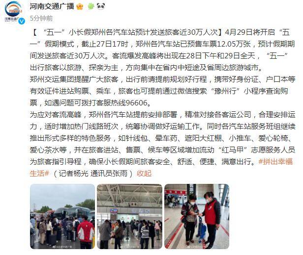 4月29日将开启“五一”假期模式,截止27日17时,郑州各汽车站已预售车票12.05万张,预计假期期间发送旅客近30万人次。客流爆发高峰将出现在28日下午和29日全天,“五一”出行旅客以旅游、探亲为主,方向集中在省内中短途及省周边旅游城市。