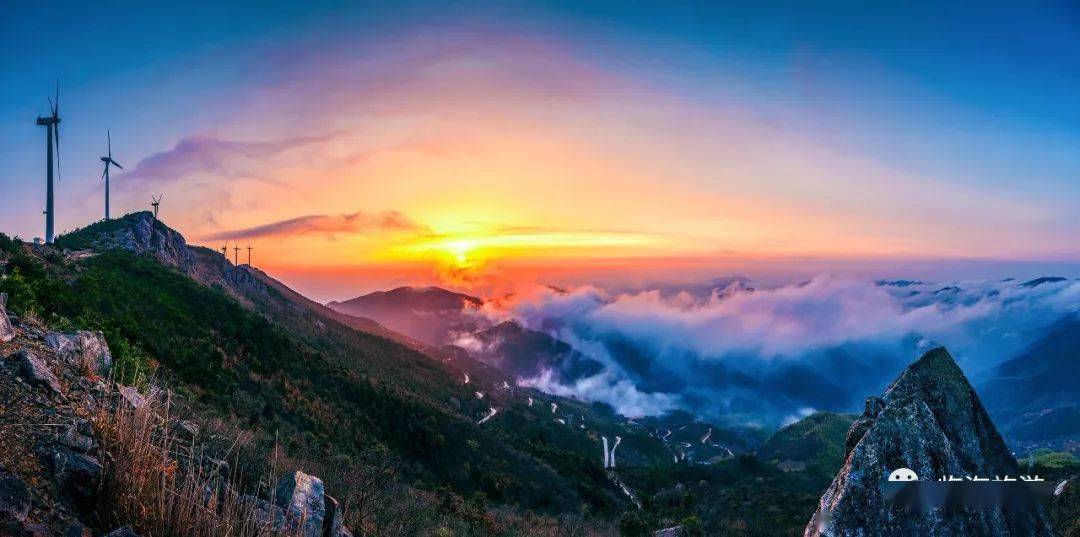 在临海看日出,首推括苍山。括苍山主峰米筛浪海拔1382.6米,是浙东南第一高峰,也是21世纪中华大地上第一缕阳光首照地。山顶还有巨大的风车迎着太阳转动,翻滚的云海仿佛就在脚边,画面实在绝美!