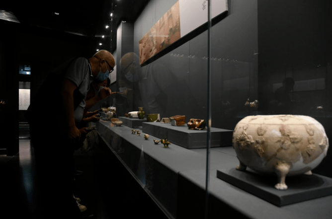 到 只有河南·戏剧幻城欣赏“麦田里的博物馆”。本次展览共联合河南博物院、中国文字博物馆、开封博物馆及黄河博物馆联盟成员单位精选出59件展品,分为“塑魂”“铸根”“同源”“铭心”“守望”五个单元,年代纵贯新石器至明清时期,类型涵盖青铜器、陶器、瓷器、石器、金器,其中不仅有贾湖骨笛、莲鹤方壶、武则天金简等大家耳熟能详的省内展品,还有马踏飞燕、三星堆面具、西夏扁壶等多个省外知名展品。